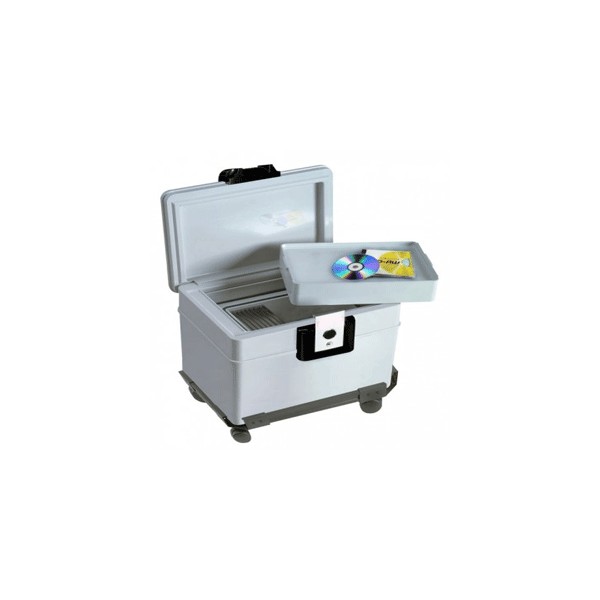Caja ignífuga portátil para almacenar soportes de datos tales como: Cds, Dvds, disquetes, cintas, cartuchos, etc. Esta caja ignífuga dispone de las Certificaciones UL Class 125 y Class 52 (Underwriters Laboratories, USA) para soportar una temperatura de 1000ºC durante 1 HORA, mientras conserva una temperatrura interior por debajo de 52ºC, garantizando una protección total durante 60 minutos contra fuego y humedad. Cajas ignífugas equipadas con carrito de ruedas y cerradura de seguridad con dos llaves.